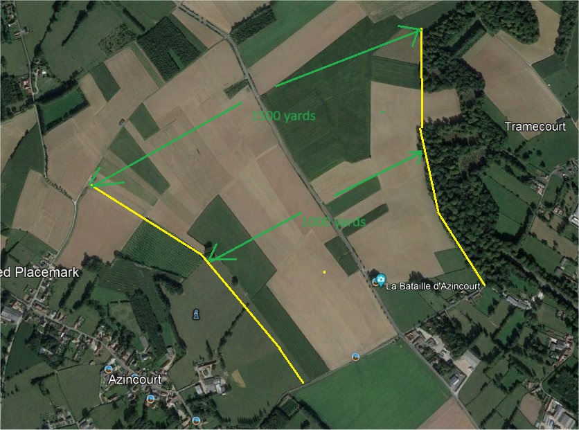 The key is the centre. The centre is at least 400 yards from the flanks at any given point. If Henry places his archers on the flanks which is written in all accounts BTW how is he going to defend the centre with only 1500 men at arms? Think about it. The maximum range of the longbow is 280-300 yards. If the French march down the centre of the battlefield, down the road then they are out of longbow range. Henry would never fight here in a month of Sundays, its too wide for archery support.
